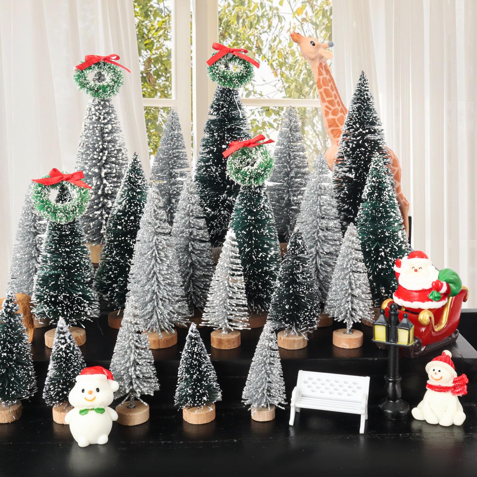 Mini Miniature Christmas Pine Tree Bottle Brush Trees Wooden Bases Tree for Your Village Desktop Xmas Holiday Party (Silver/Green 30pcs)
