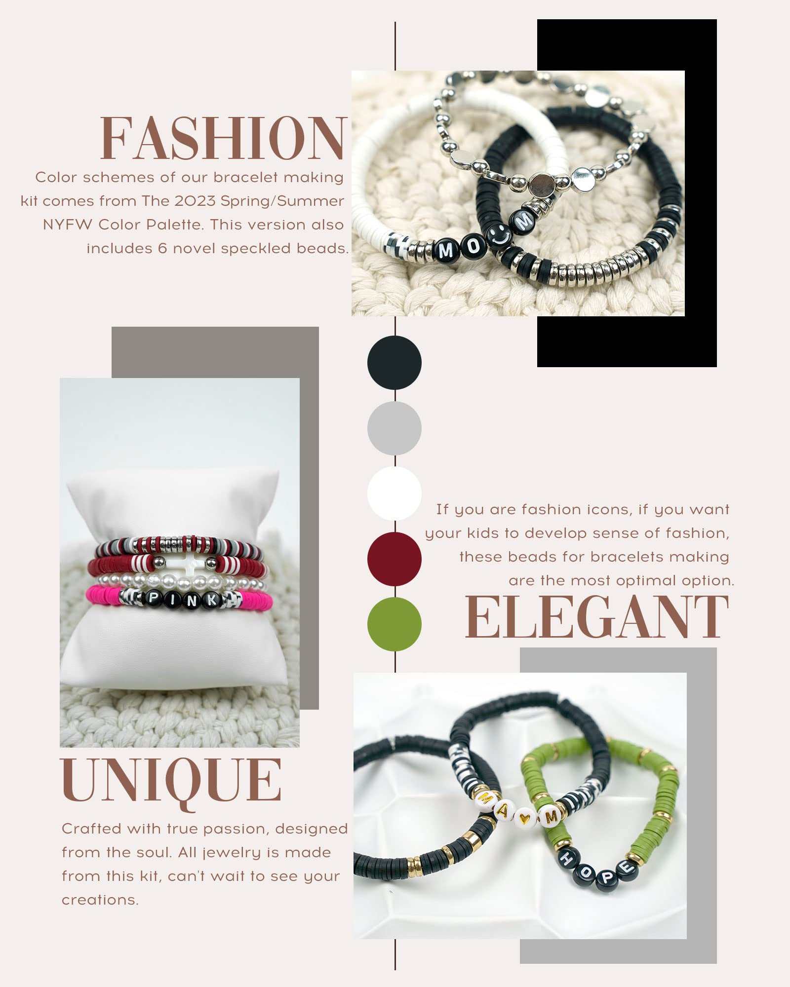 - High-Quality Clay Beads: Color schemes of our bracelet making kit for girls comes from The Spring/Summer 2023 NYFW Color Palette. 24 colors strictly selected popular colors which will meet all your DIY needs. The kit includes a range of clay beads, each made with premium quality, non-toxic polymer materials for long-lasting wear. The beads are designed to be durable and easy to handle, making it easy for your create beautiful bracelets.