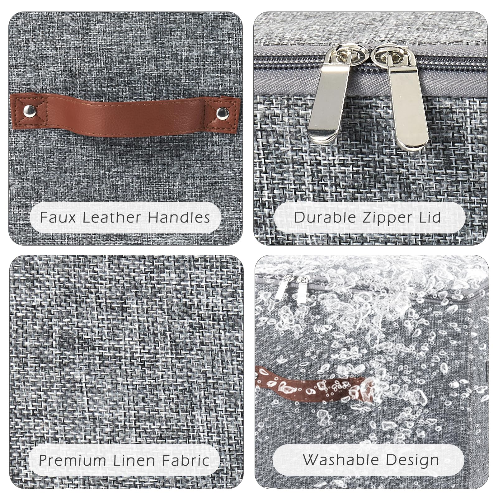 Storage Bins with Zipper Lid Cotton Linen Fabric Lidded Storage Baskets Boxes Foldable Washable Closet Shelf Clothes Organizer Container with PU Leather Handles (Gray, Small Size)
