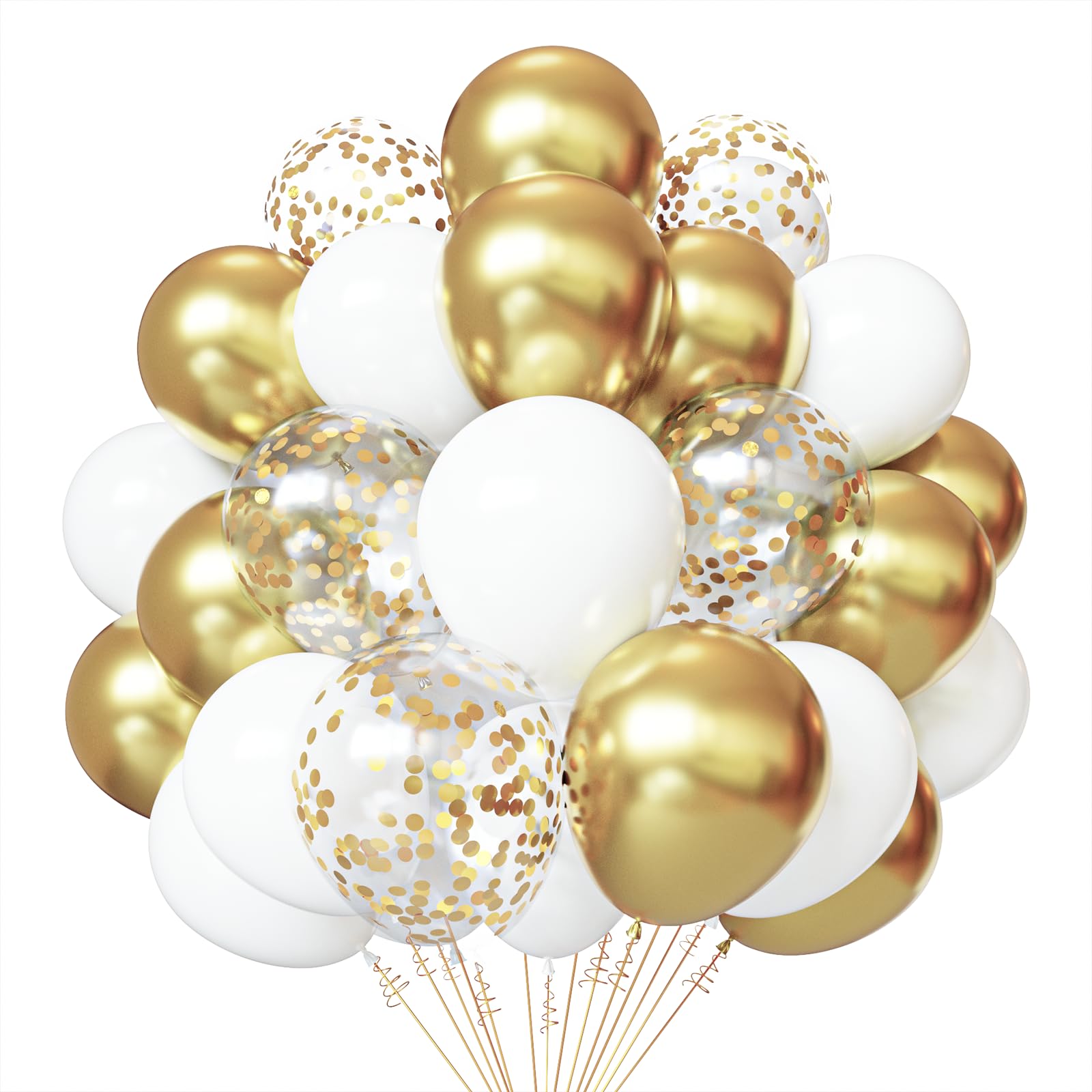 - 【What You Will Get】:White and Gold Confetti Balloons sets contains 50pcs balloons, 20pcs white balloons, 15pcs gold balloons, 15pcs gold confetti balloons, and 1pcs gold ribbon (33 feet total). These latex balloons can inflate hydrogen, helium ( it will float more than 12 hours), and air.