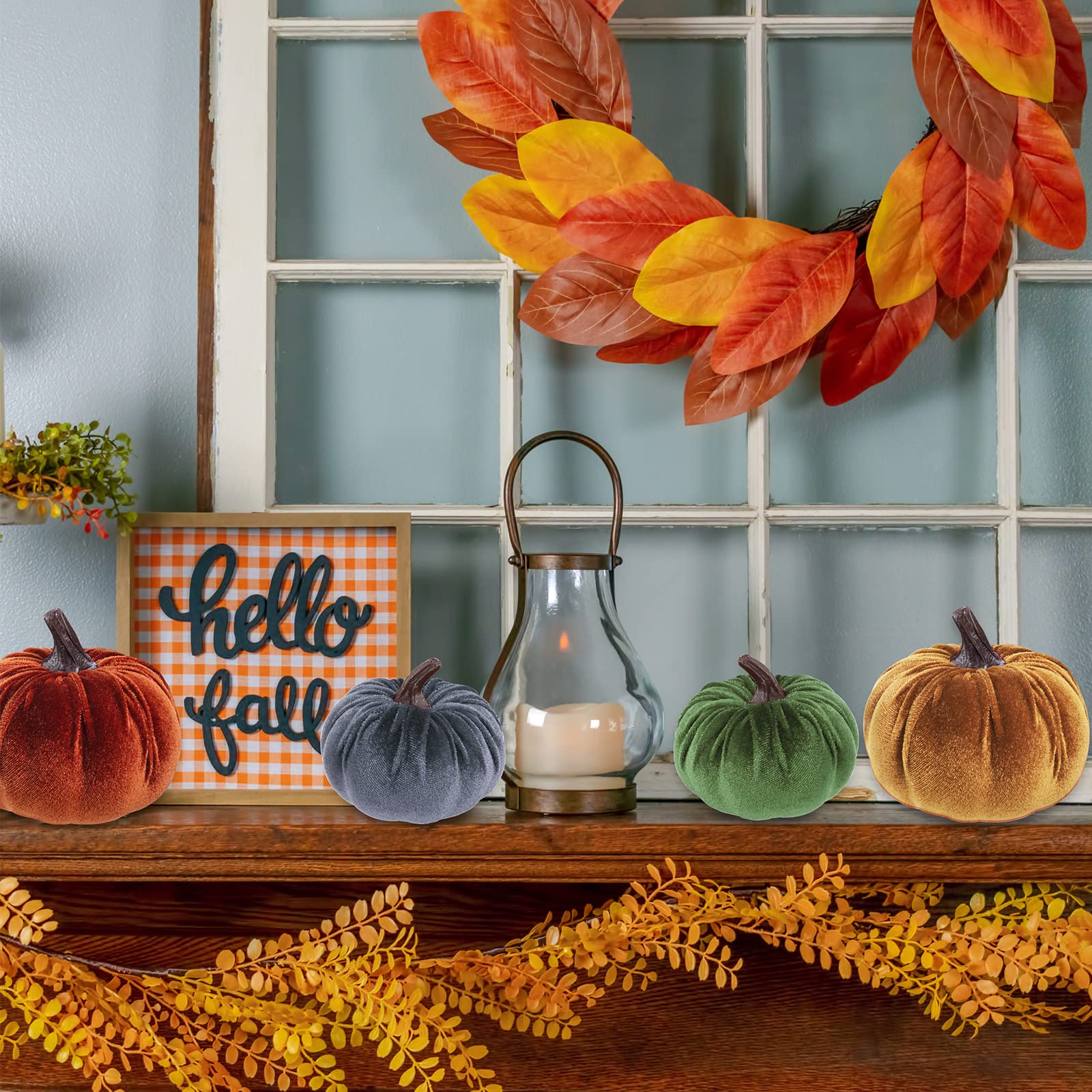 - Color: This set of Harvest velvet pumpkins comes in 4 traditional fall shades of Rust, Gold, Olive, and Gray. Each pumpkin comes with a brown stem at the top. In a mix of classic Harvest colors, decorative pumpkins seamless blend in with any decoration from modern farmhouse to rustic, perfect to create a holiday atmosphere for fall events, Halloween, and Thanksgiving. Fall is definitely here, and our velvet pumpkins are ready to transform your home with a touch of warmth!