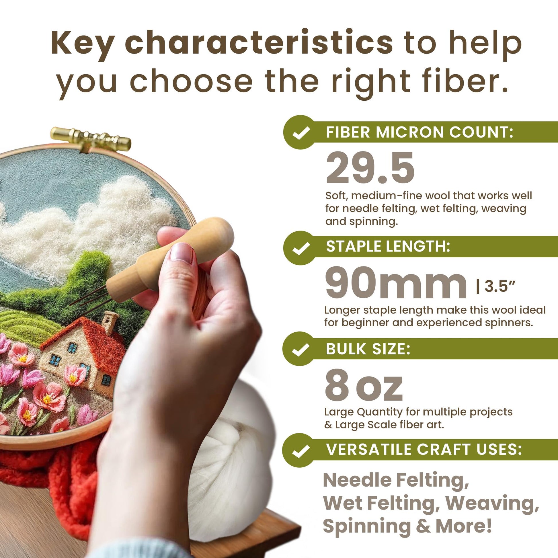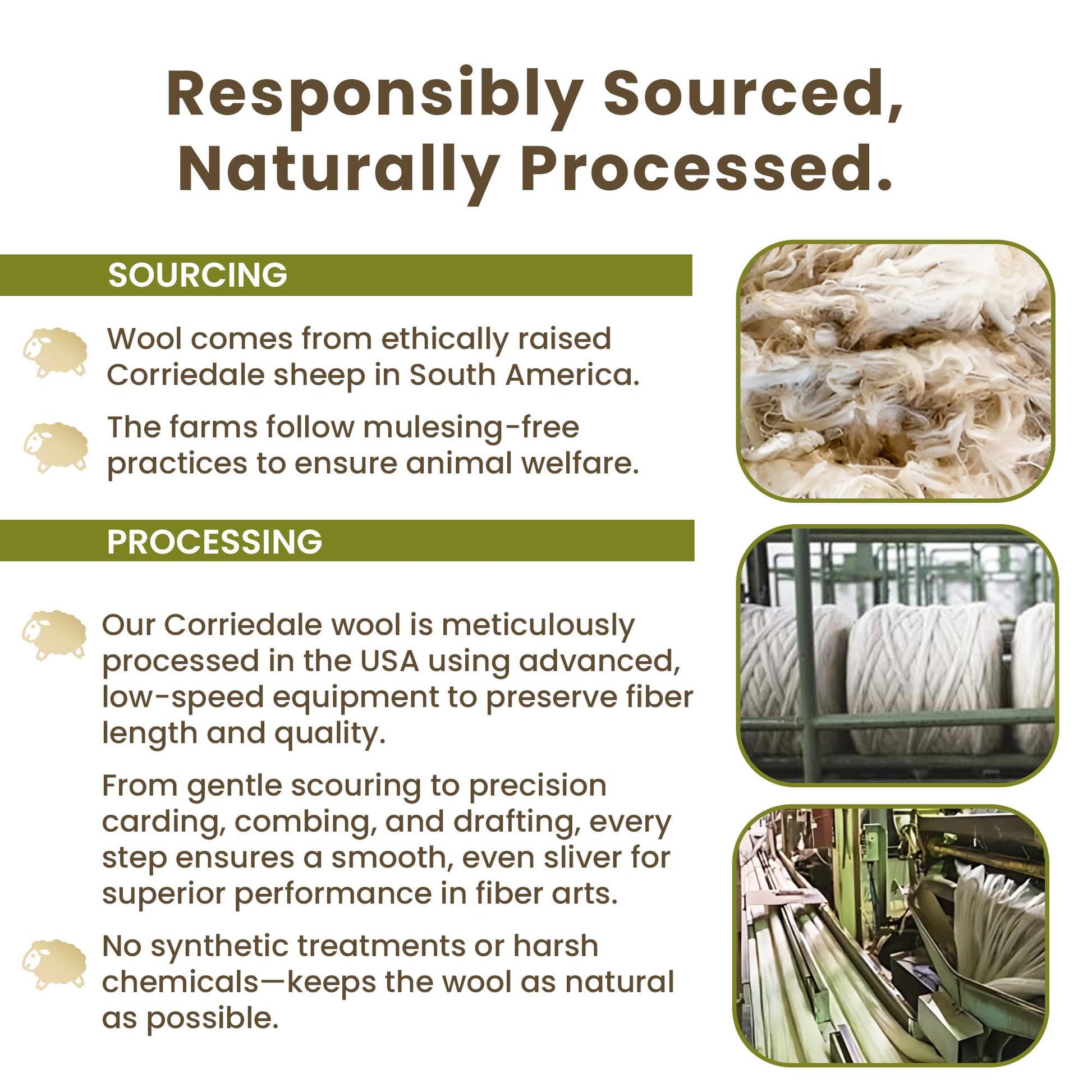 - Premium Wool Processed in USA – Our raw wool comes from Corriedale sheep in South America, a region known for its high-quality felting wool. We work with top mills to ensure soft, clean, and minimally processed roving wool in a rich, un-dyed natural ecru color. Perfect for needle felting wool bulk and wool craft felting.