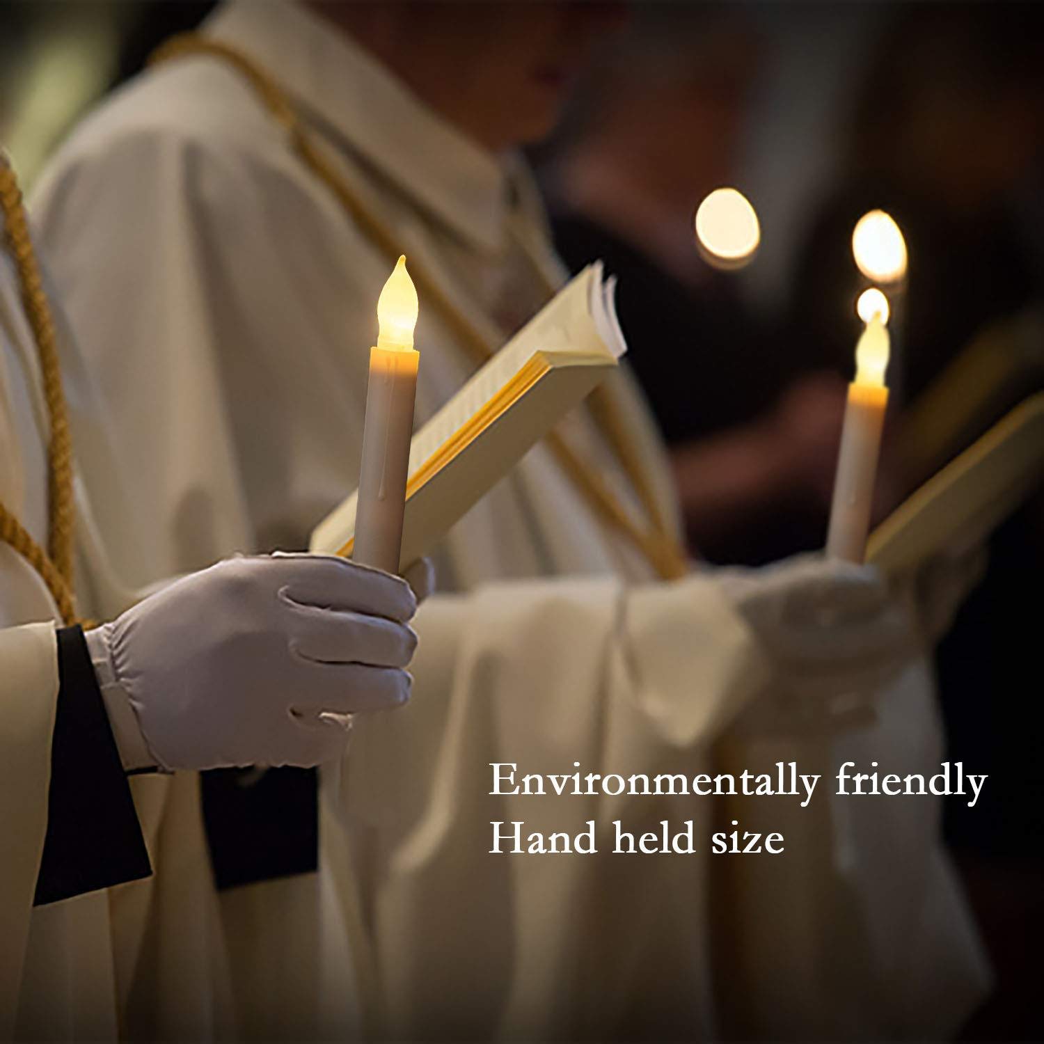 - IDEAL DECORATION - The realistic battery operated taper candles have warm white flicking flame. These handheld flickering battery candles are perfect for Halloween decor, dinner table, church service, birthday, wedding, fireplace, Christmas decor.